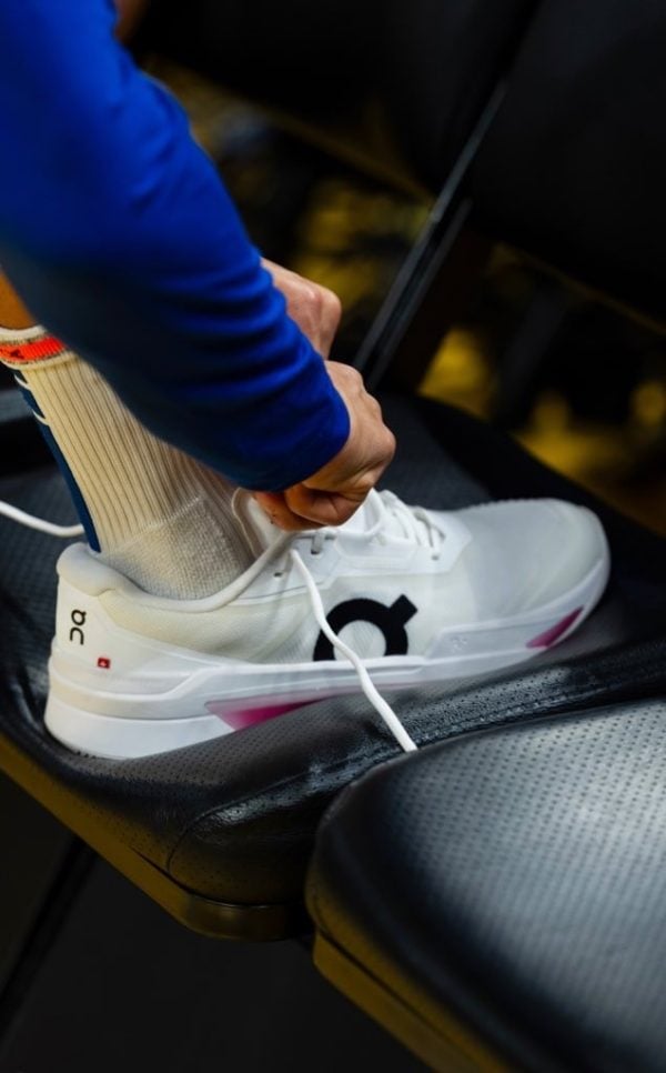 Ahead of tip-off, Curry was spotted warming up in Roger Federer’s signature On THE ROGER Pro Fire tennis shoes. This marks a historic milestone: the first time a professional basketball player has EVER worn On footwear on a court.